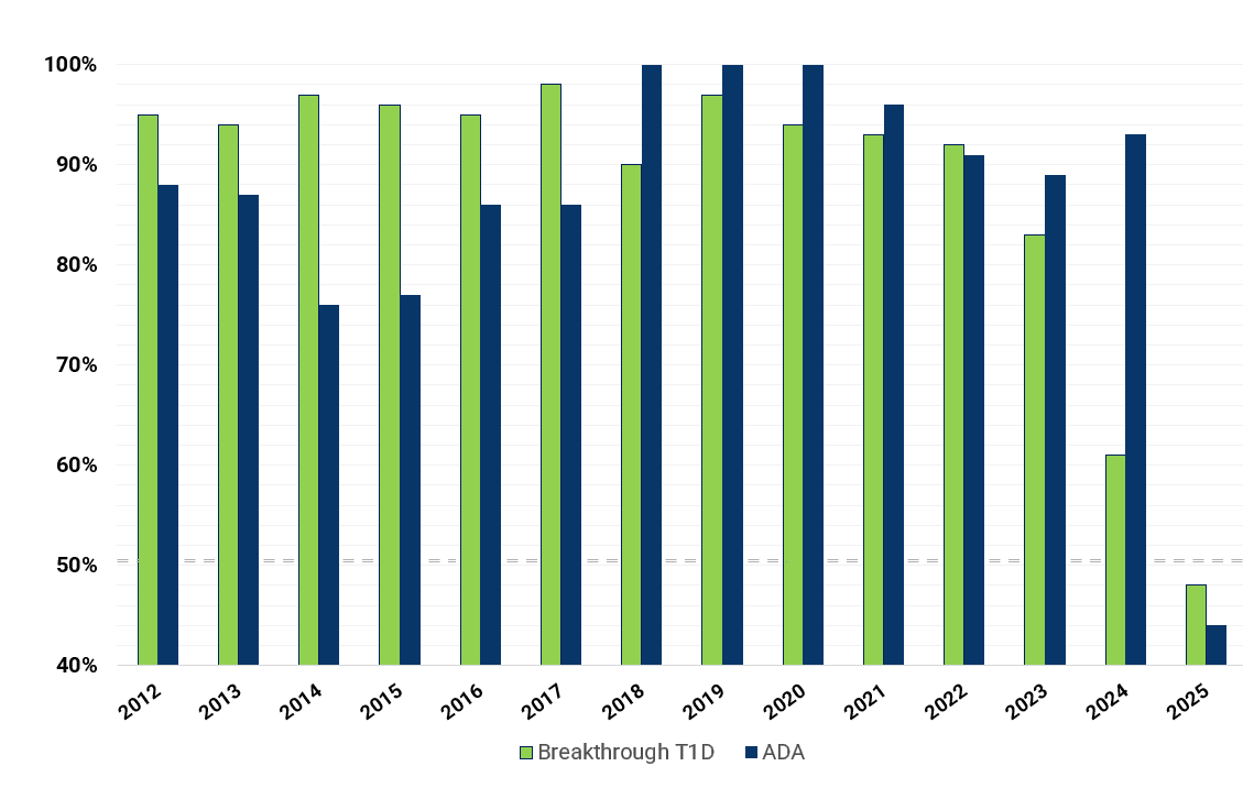 Analysis is based on a comprehensive review of both organizations’ 2025 US event calendars. Breakthrough T1D’s and ADA’s publicly available financial data from the most recent fiscal year ending in 2024 (FY24) were used to determine revenue and research grant spending.