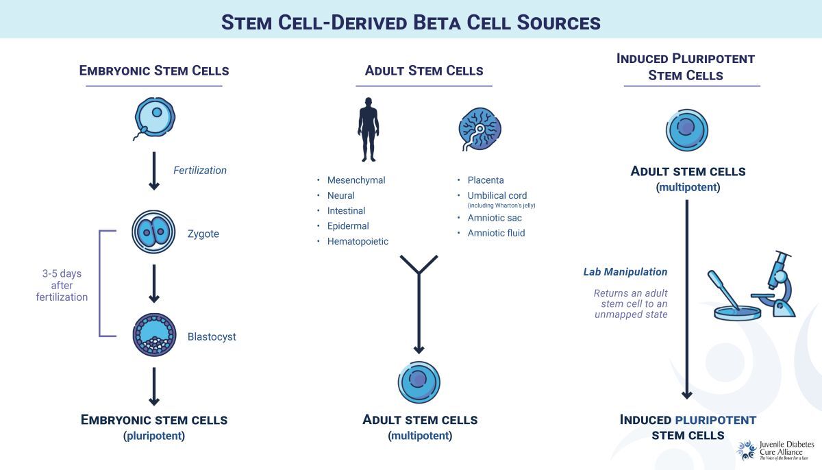 For T1D, stem cells are engineered in the lab to become functional beta cells. There are three main sources of sBCs: