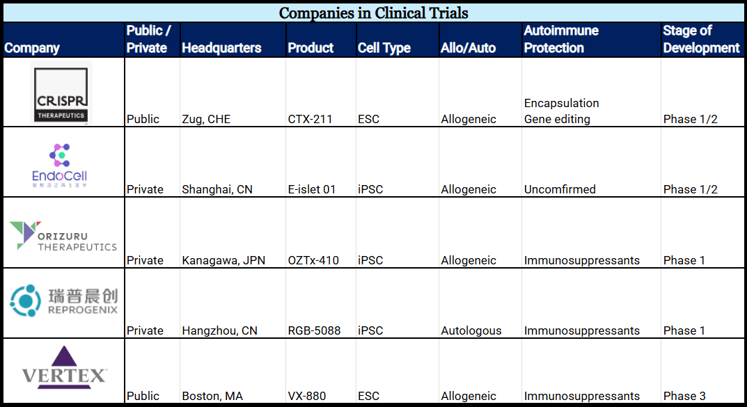 3. EndoCell’s product, E-islet 01, is testing blood-derived iPSCs in a phase I/II clinical trial. The trial was initiated in August 2025, recruiting individuals with established T1D and severe hypoglycemia. At this time, it is unknown what method of protection is being used.