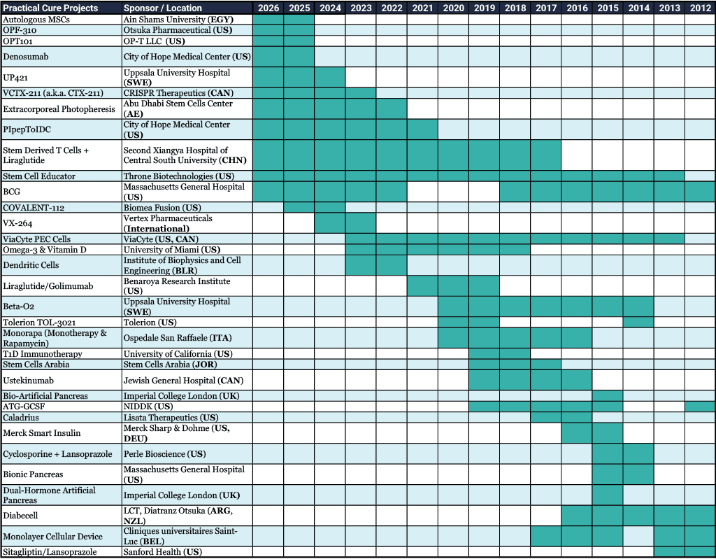 Over the past fifteen years, JDCA has identified and written about thirty-three Practical Cure projects that were, at one time or another, active in human clinical trials. All of these projects were listed in the US clinical trial registry, and several hosted multiple trials testing different patient groups, dosing levels, and other variables (see Appendix A).